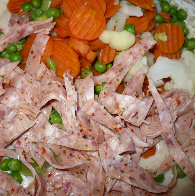4. A zöldséget és a feldarabolt felvágottat belekeverjük a besamelbe.